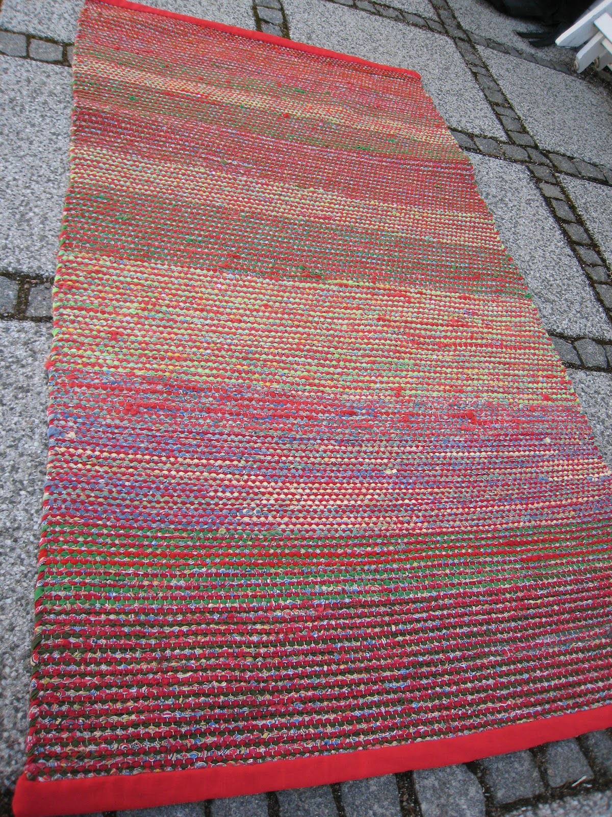 Maton kanttaus olikin oikukas juttu. Opin Turun symposiumissa tekemään kanttauksen siten että, kantista tehdään maton levyinen pussi, mikä sovitetaan sitten mattoon ja ommelaan käsin molemmilta puolilta. 1. kokeilu Tein juuri näin pussin, mutta ompelin ompelukoneella, nahka neulalla luisti hyvin. Eipä ne reunat menneet kauniisti päällekäin vaan ommel seikkaili maton alapuolella sinne tänne, joten pääsin purkuhommiin. Tässä välissä piipahdin kutomakerholla ja kokeneelta kutojalta sain vinkin. 2. kokeilu Ompelin toisen puolen kantista koneella nurjalta puolelta ja käänsin sitten oikein päin toiselle puolelle mattoa, ja toisen puolen ompelen käsin. Tämä toimii!